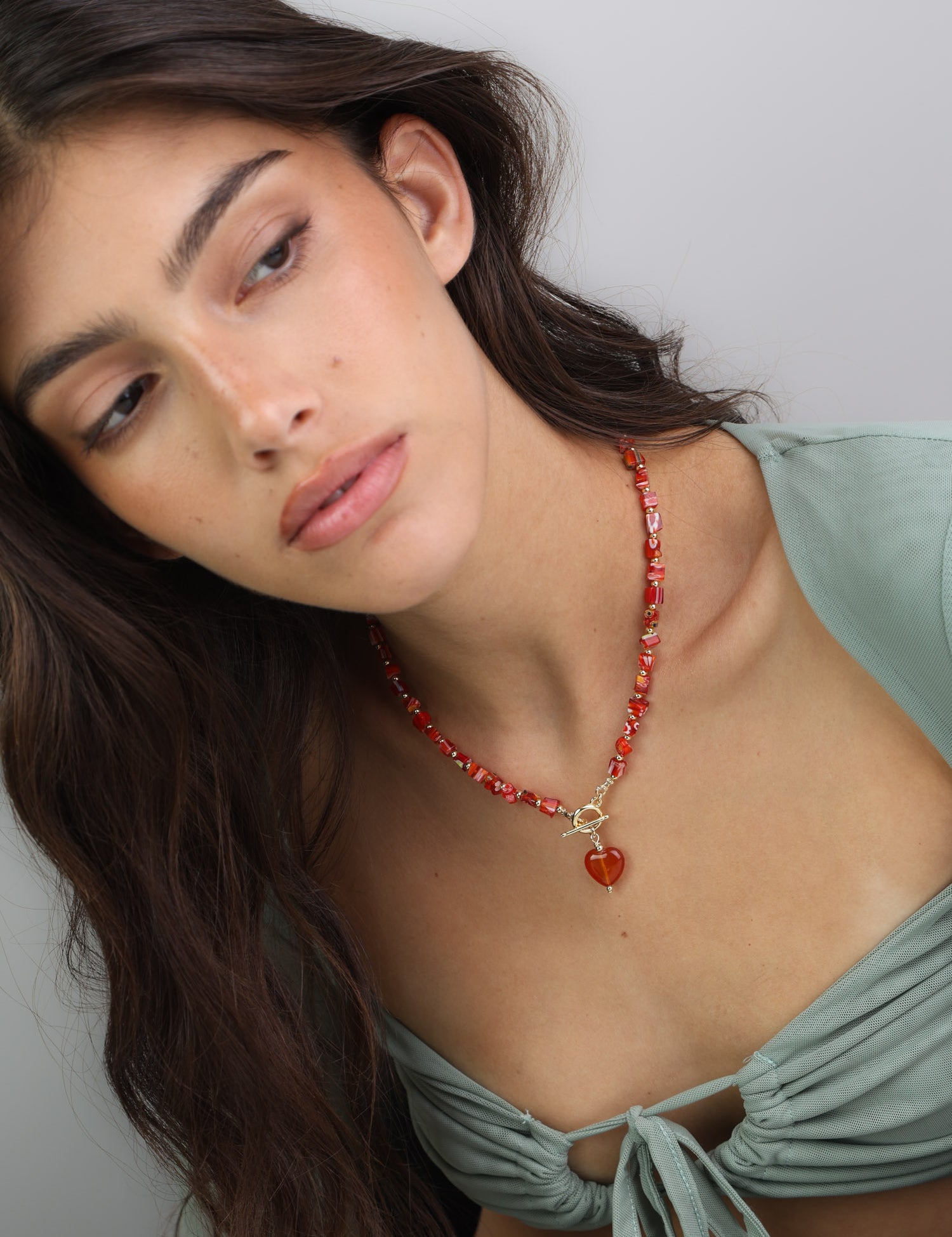 Colar de pedras banhado a ouro com ágata e cristal vermelho e pendente coração