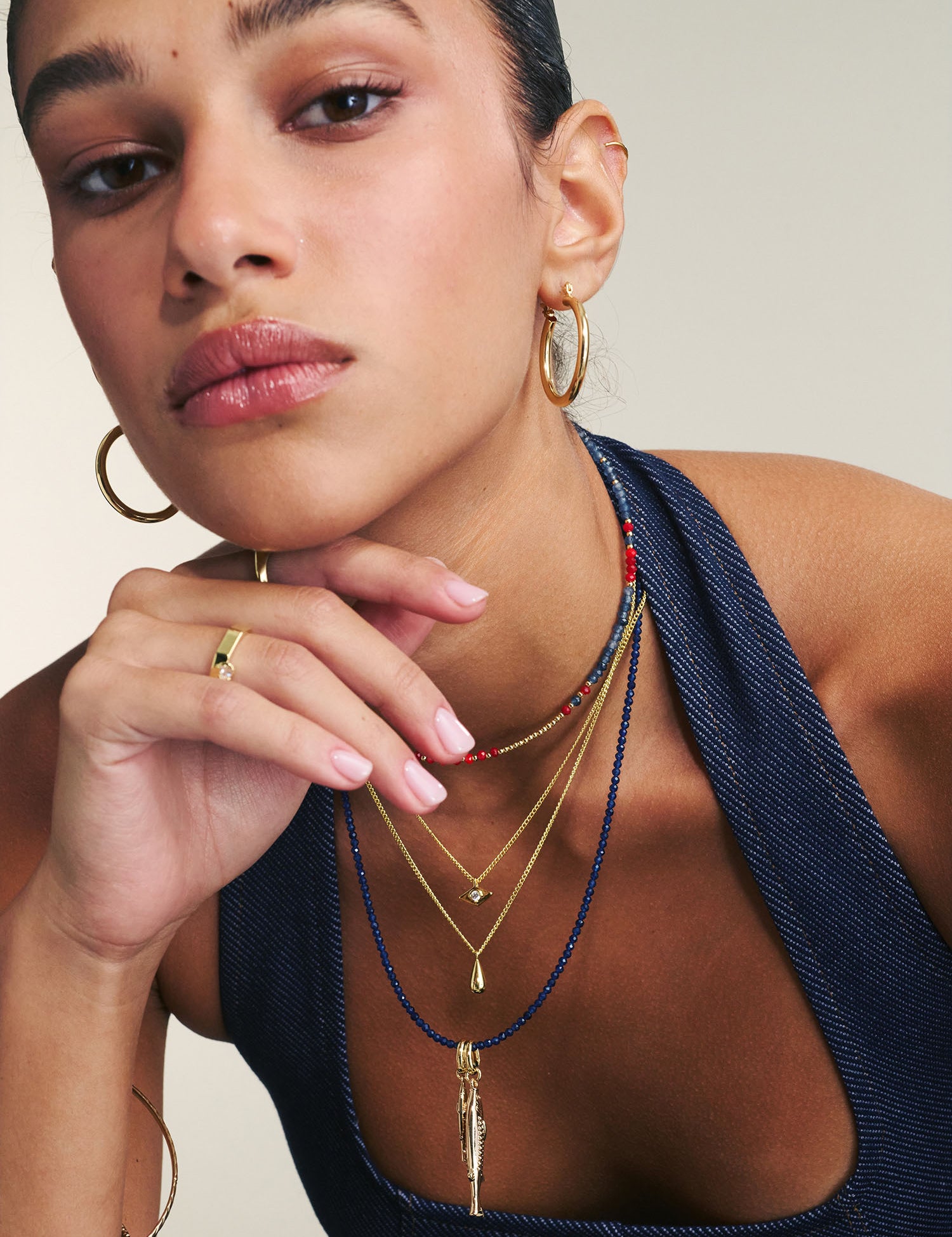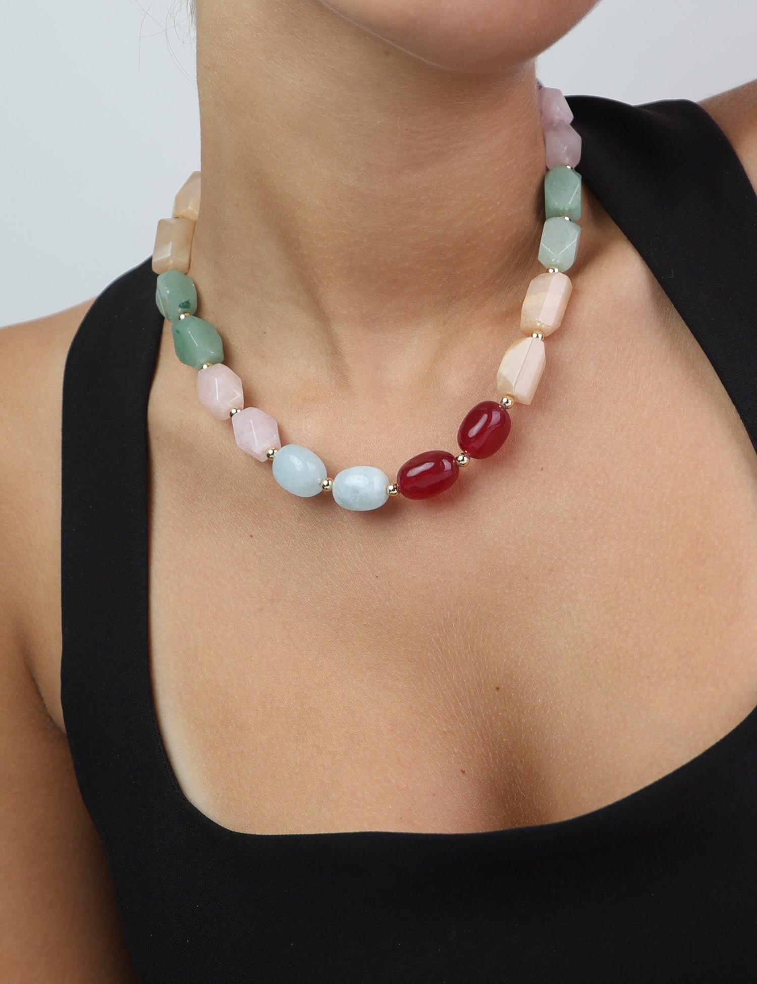 Colar de pedras banhado a ouro com quartzo, ágata, coral, jadeíte e amazonite