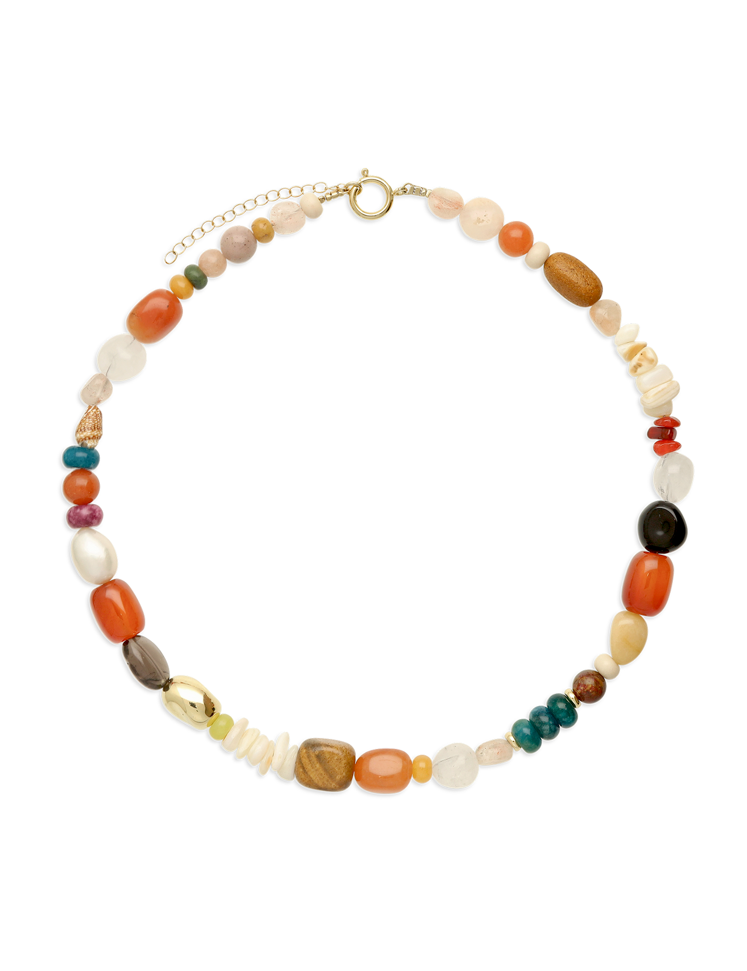 Colar de pedras banhado a ouro com ágata, quartzo turquesa, cornalina, madrepérola, jadeíte e jaspe