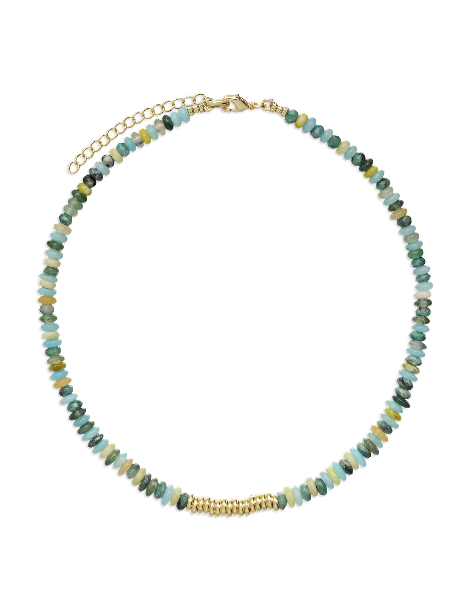 Colar de pedras banhado a ouro com quartzo, ágata, coral, jadeíte e amazonite