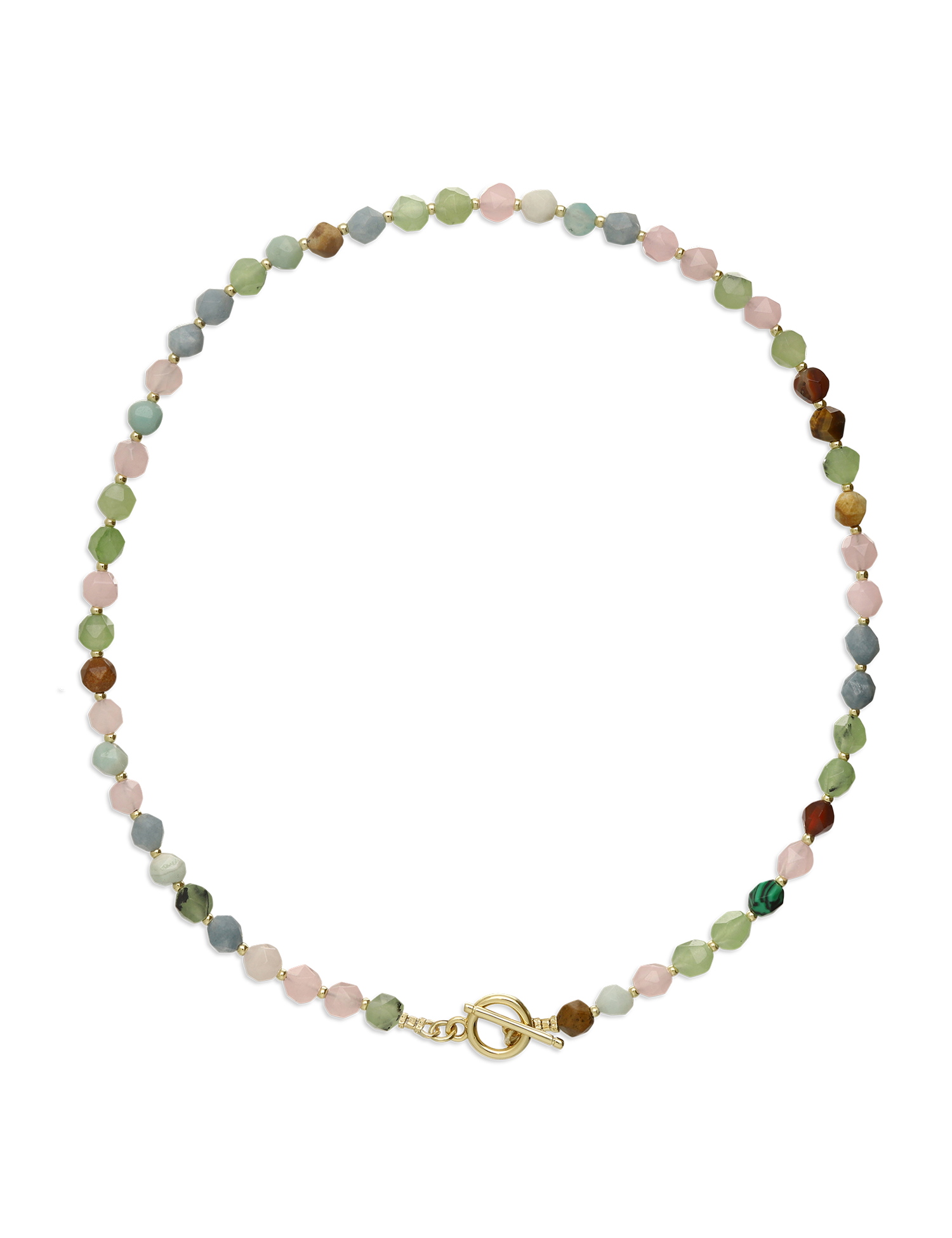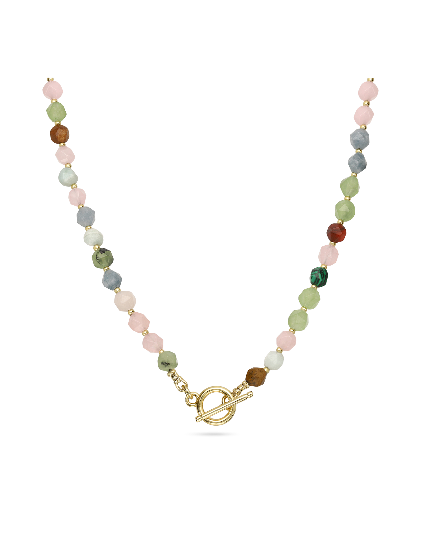 Colar de pedras banhado a ouro com quartzo, ágata, coral, jadeíte e amazonite