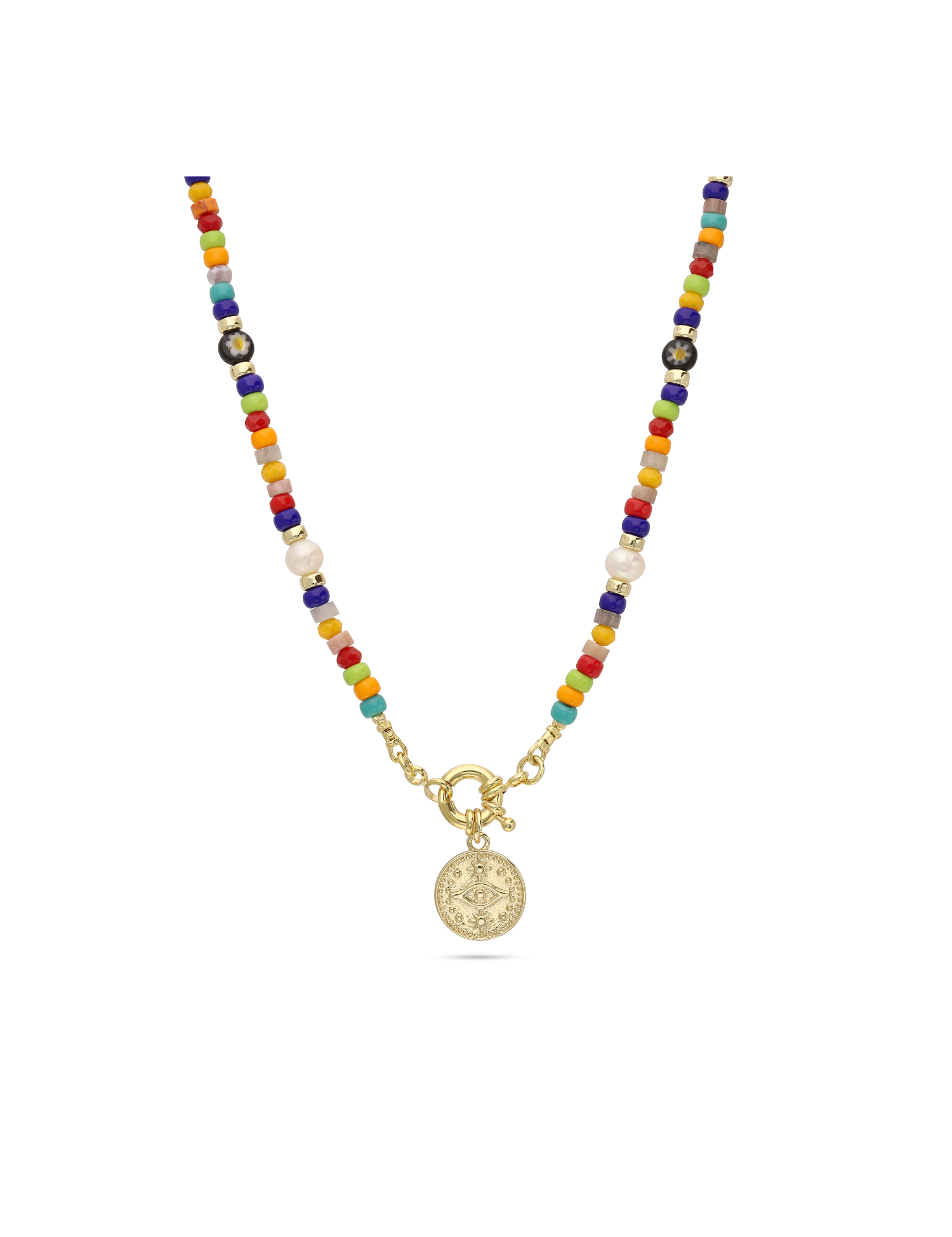 Colar de pedra banhado a ouro com vidro cristal e jadeíte colorido