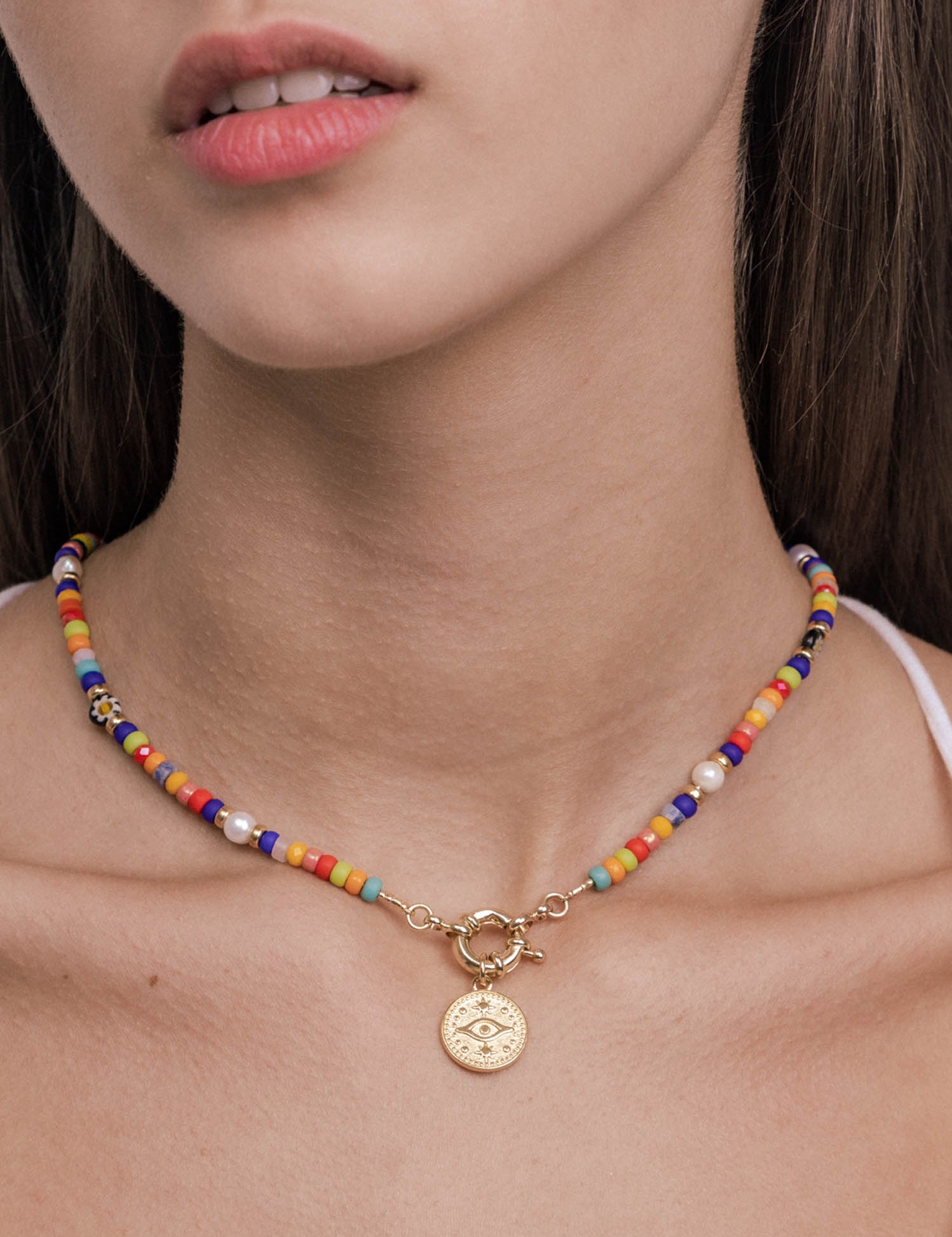 Fio com pendente banhado a ouro com pérolas e cristais coloridos