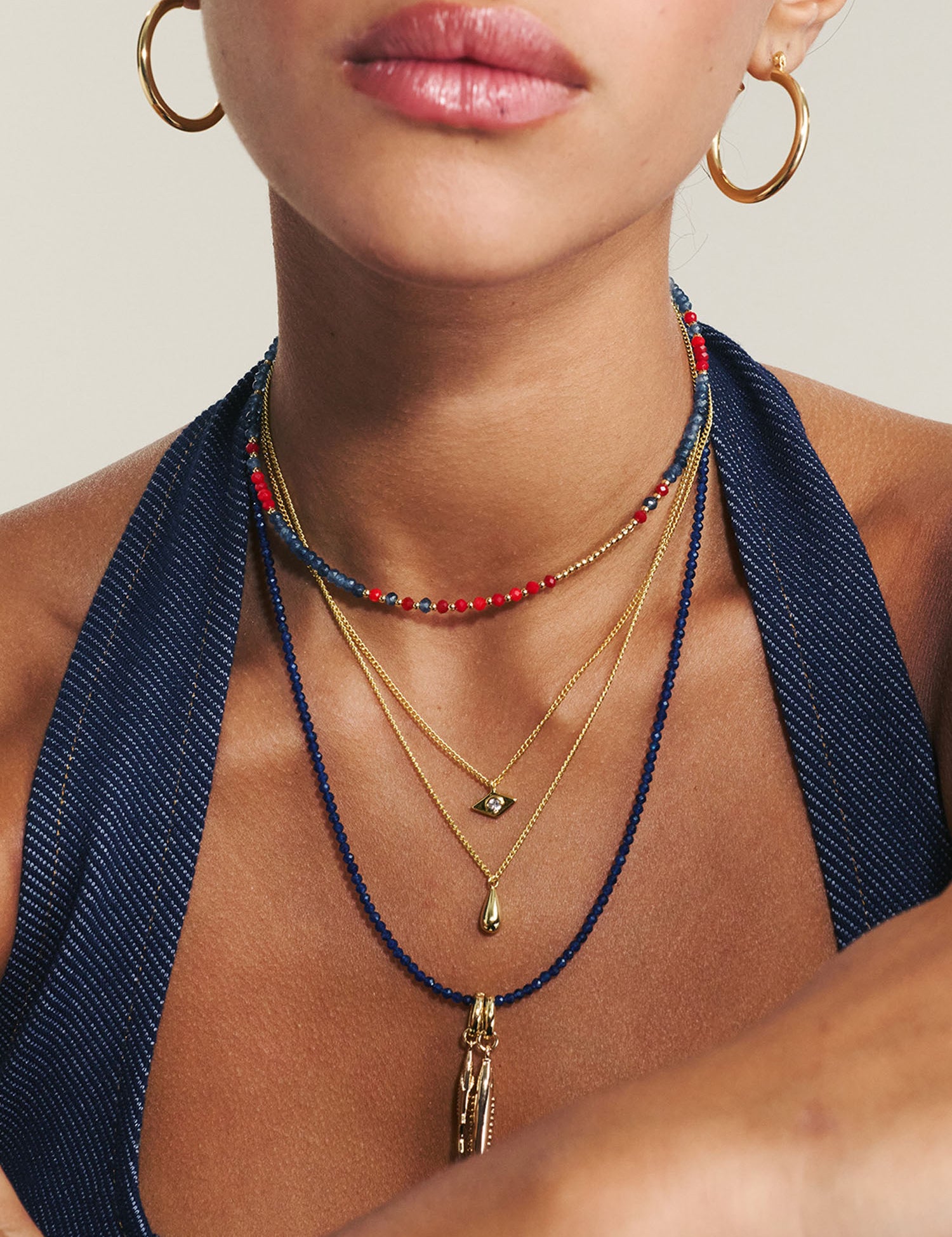 Fio com pendente banhado a ouro com pérolas e cristal azul