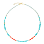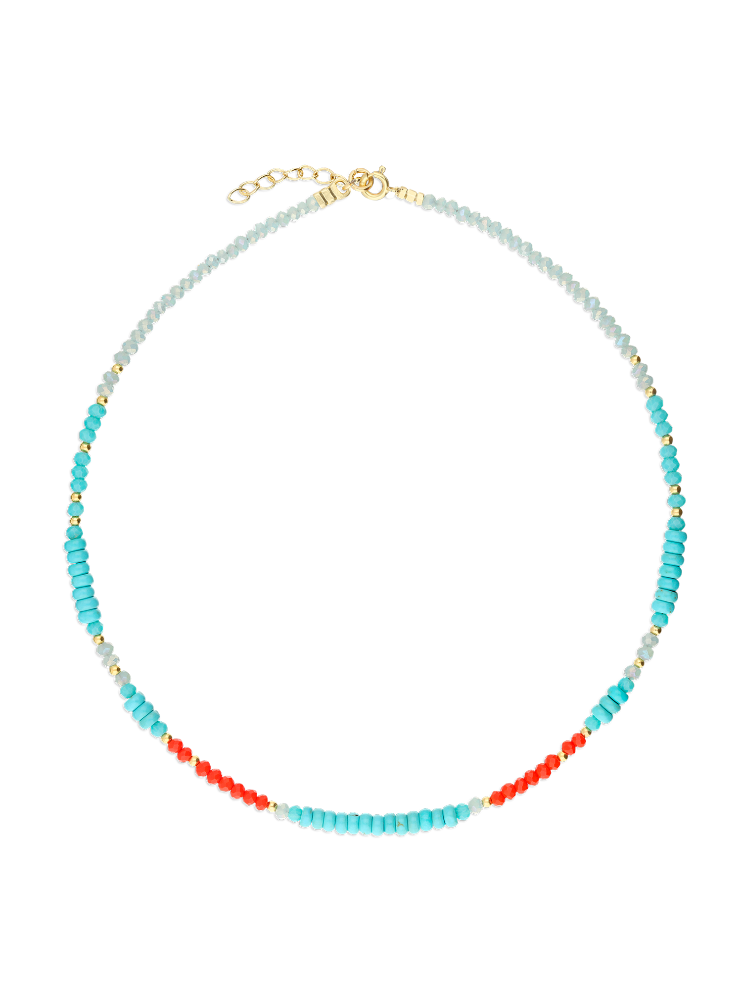 - Design: Colar choker com detalhes em círculo, apresentando vidro cristal colorido e turquesa de cultivo, criando um contraste sofisticado e alegre.