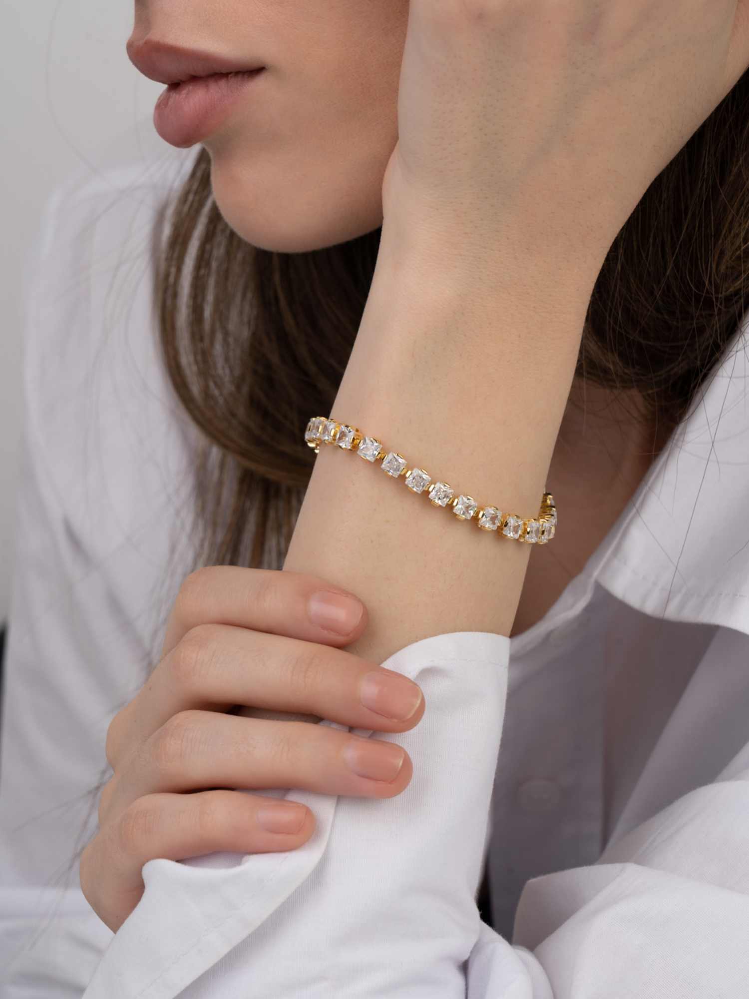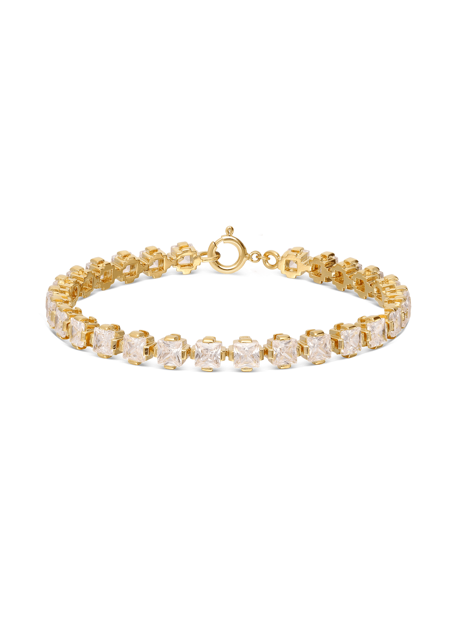 Pulseira de tenis, Banhado a Ouro, Zircónia de cultivo, Claro, Quadrado, Feito à mão,, Dourado, 11.27 gramas.