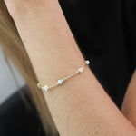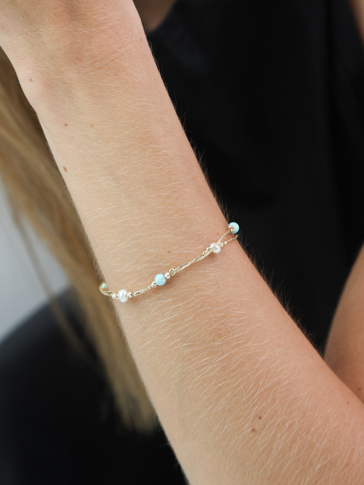 Pulseira Delicada, Banhado a Ouro, Pérola cultivada, Opala de cultivo, Turquesa, Branco, Círculo, Feito à mão,, Dourado, 2.77 gramas.