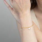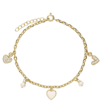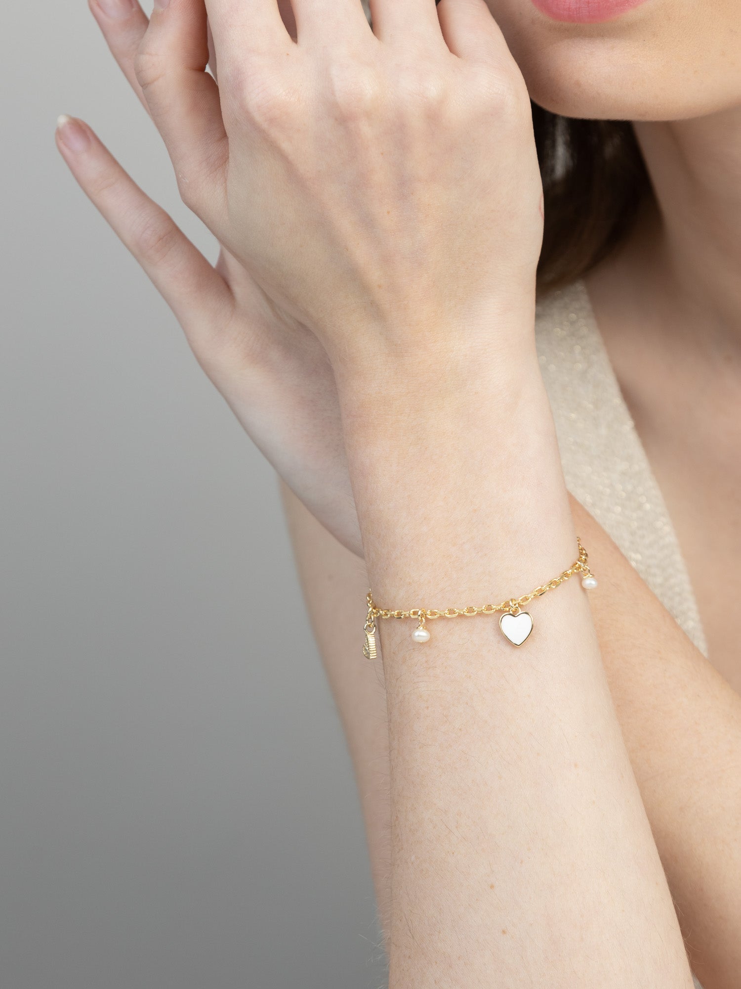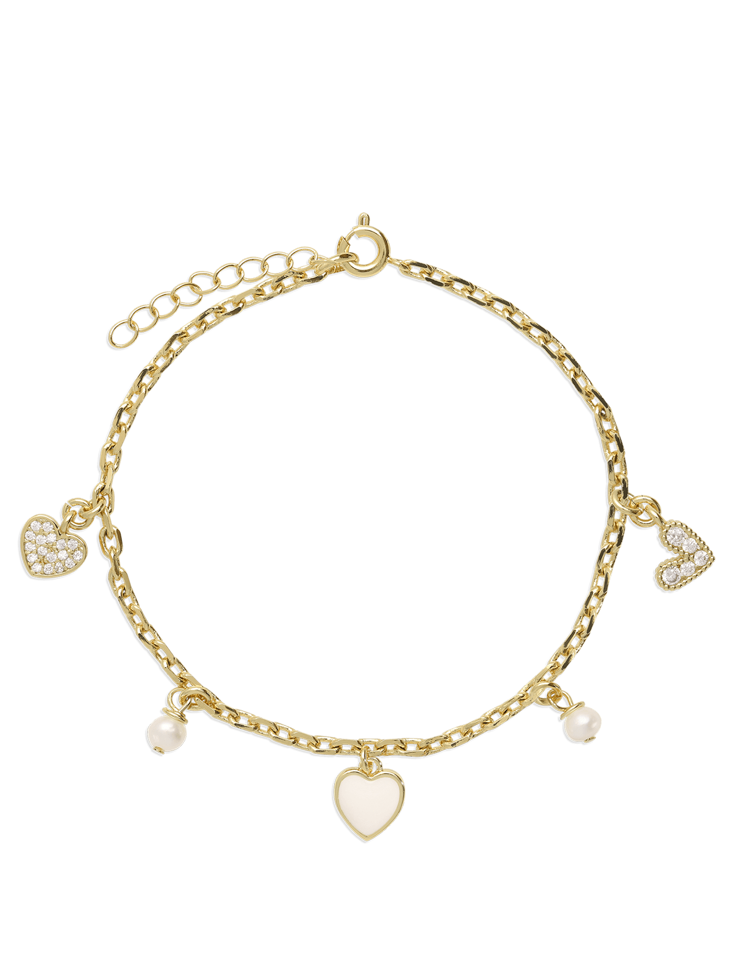 Pulseira Delicada, Banhado a Ouro, Zircónia de cultivo, Pérola cultivada, Esmalte, Branco, Claro, Coração, Círculo, Feito à mão,, Dourado, comprimento do pendente: 1.0 cm, largura do pendente: 0.8 cm, 4.25 gramas.