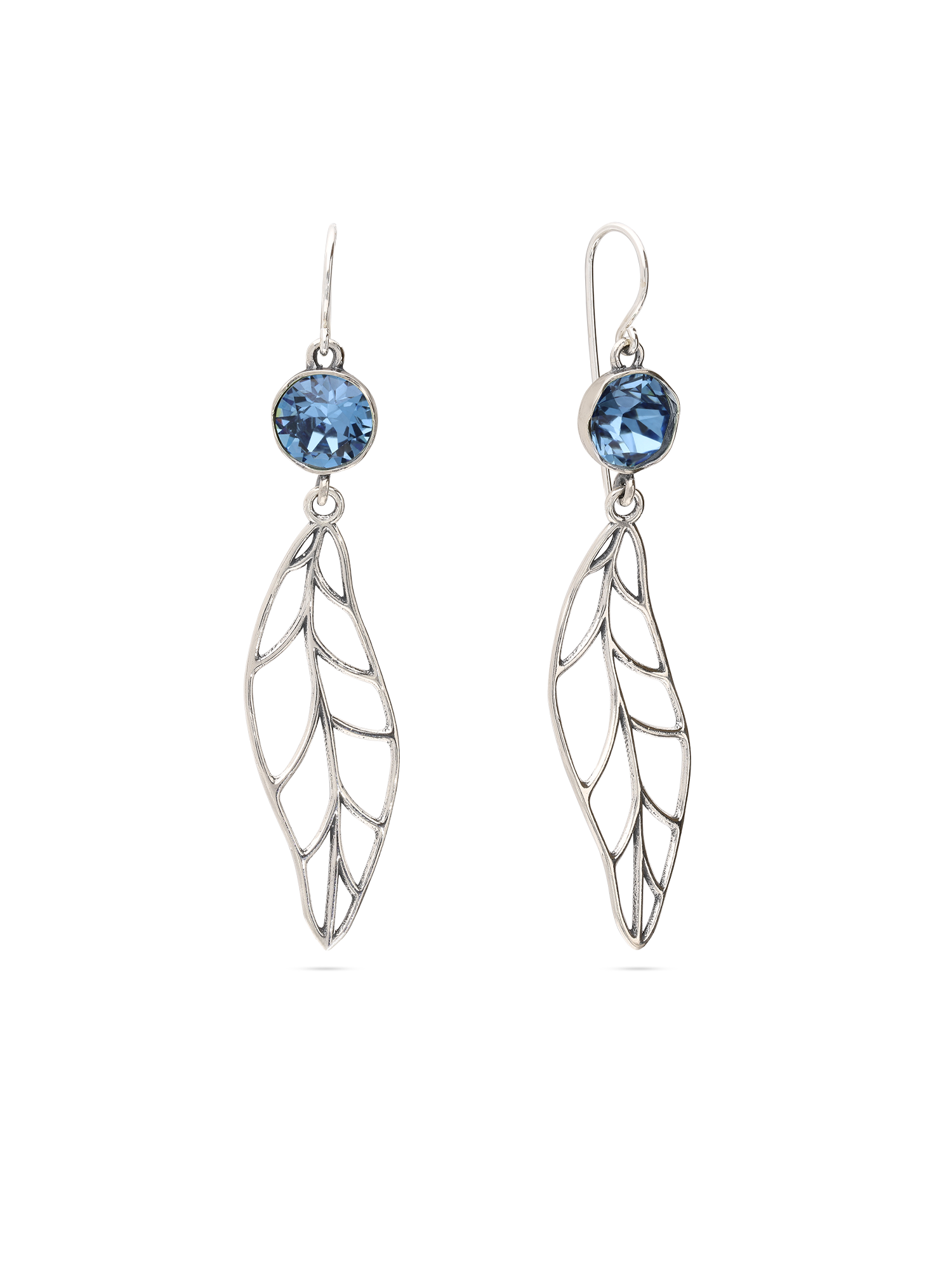 Pendentes, Prata, Cristal Swarovski de cultivo, Azul céu, Folha, Círculo, Feito à mão,, Prateado, comprimento do brinco: 6.5 cm, largura do brinco: 1.4 cm, 4.50 gramas.