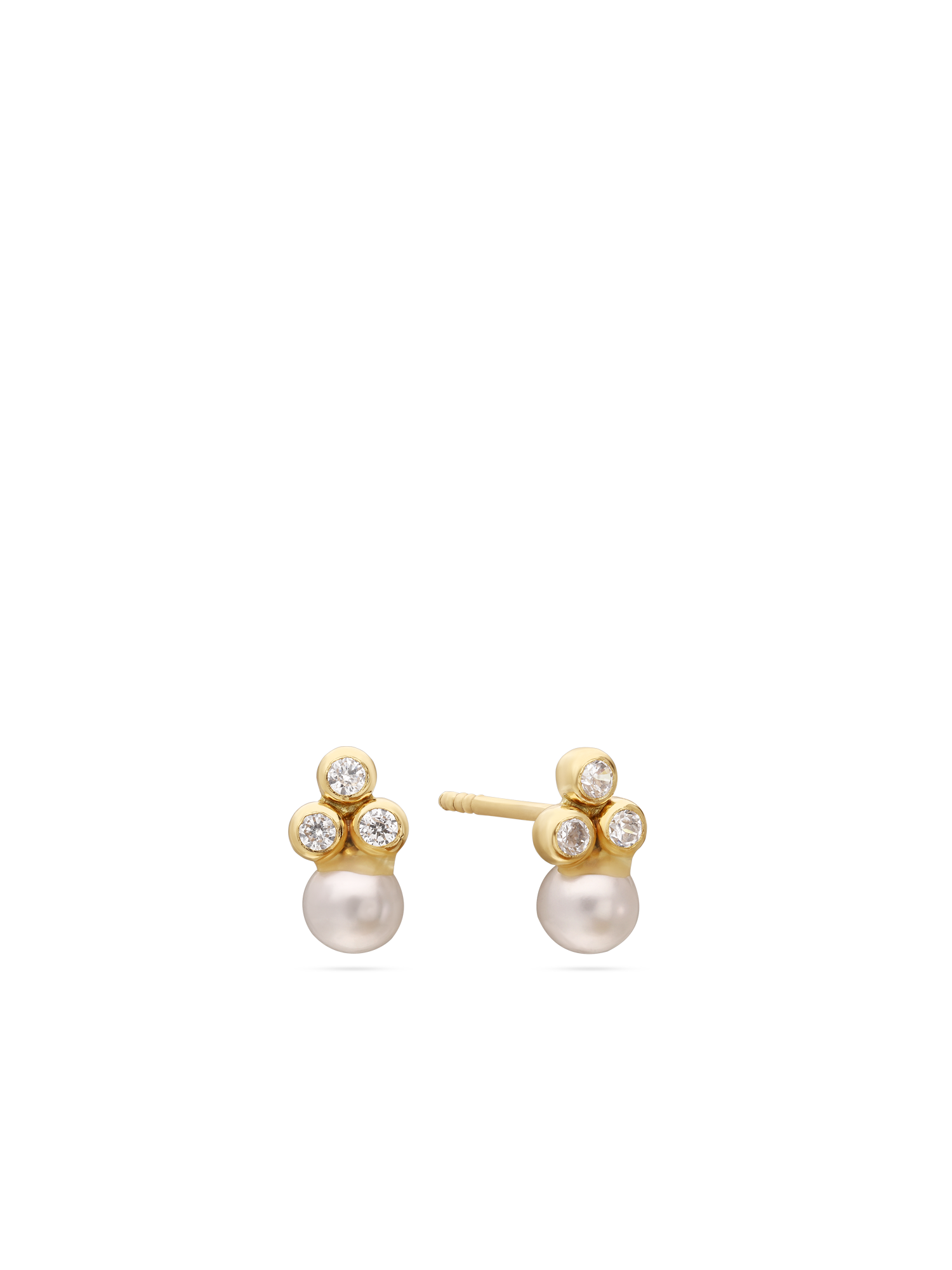 Brincos de placa, Ouro de 9 quilates, Zircónia de cultivo, Pérola cultivada, Branco, Claro, Círculo, Feito à mão, Ouro amarelo de 9K, comprimento do brinco: 8.5 mm, largura do brinco: 5.0 mm, 0.40 gramas.