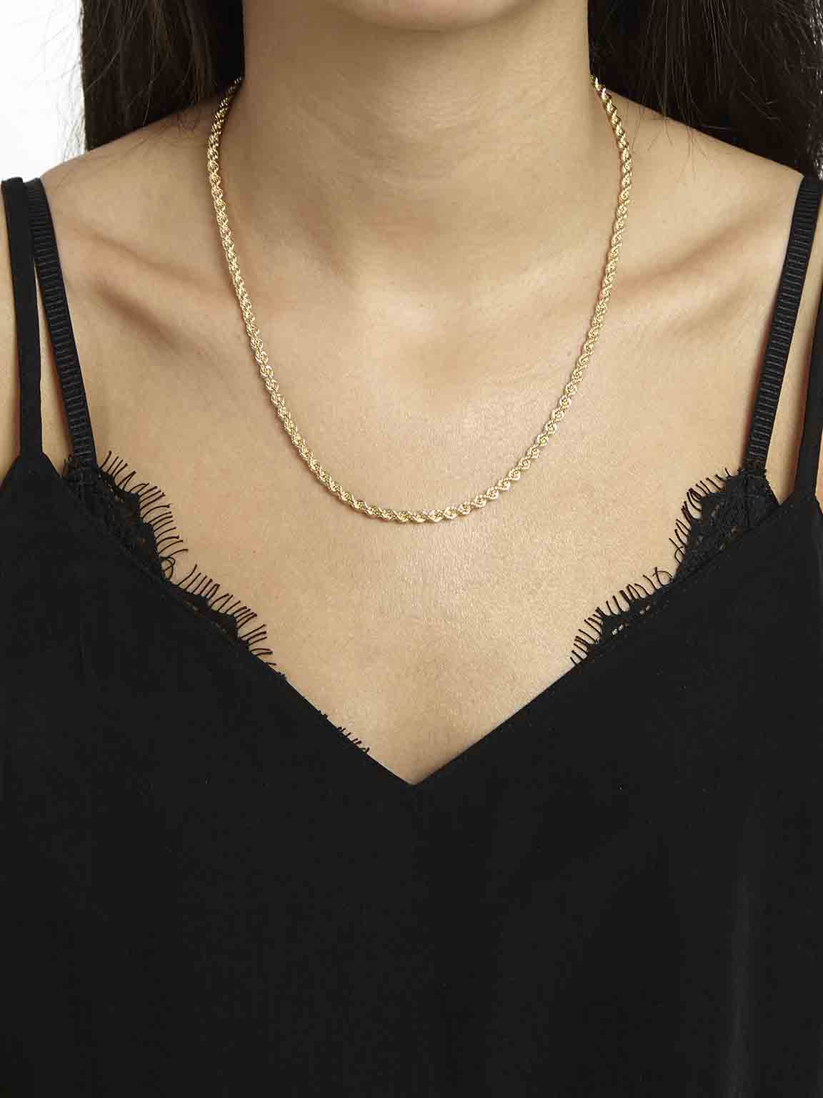Um essencial intemporal, o colar de corrente torcida banhado a ouro é a escolha perfeita para quem procura sofisticação e versatilidade. O seu design elegante valoriza qualquer look, seja usado sozinho como peça de destaque ou combinado com outros colares para um efeito moderno em camadas.