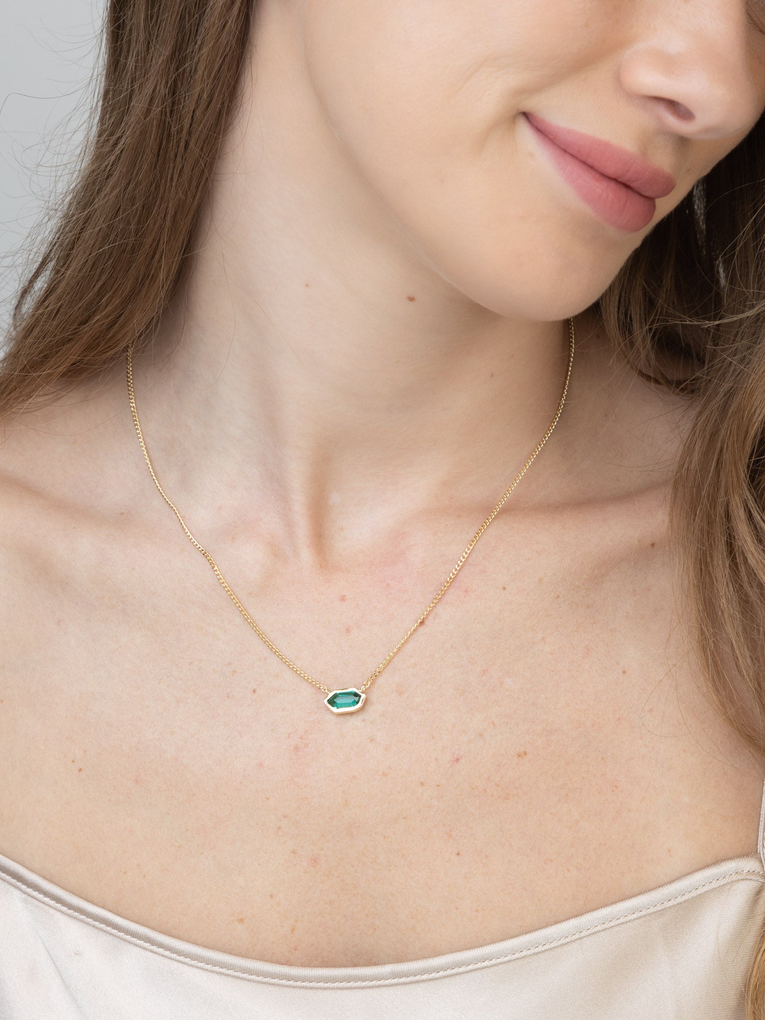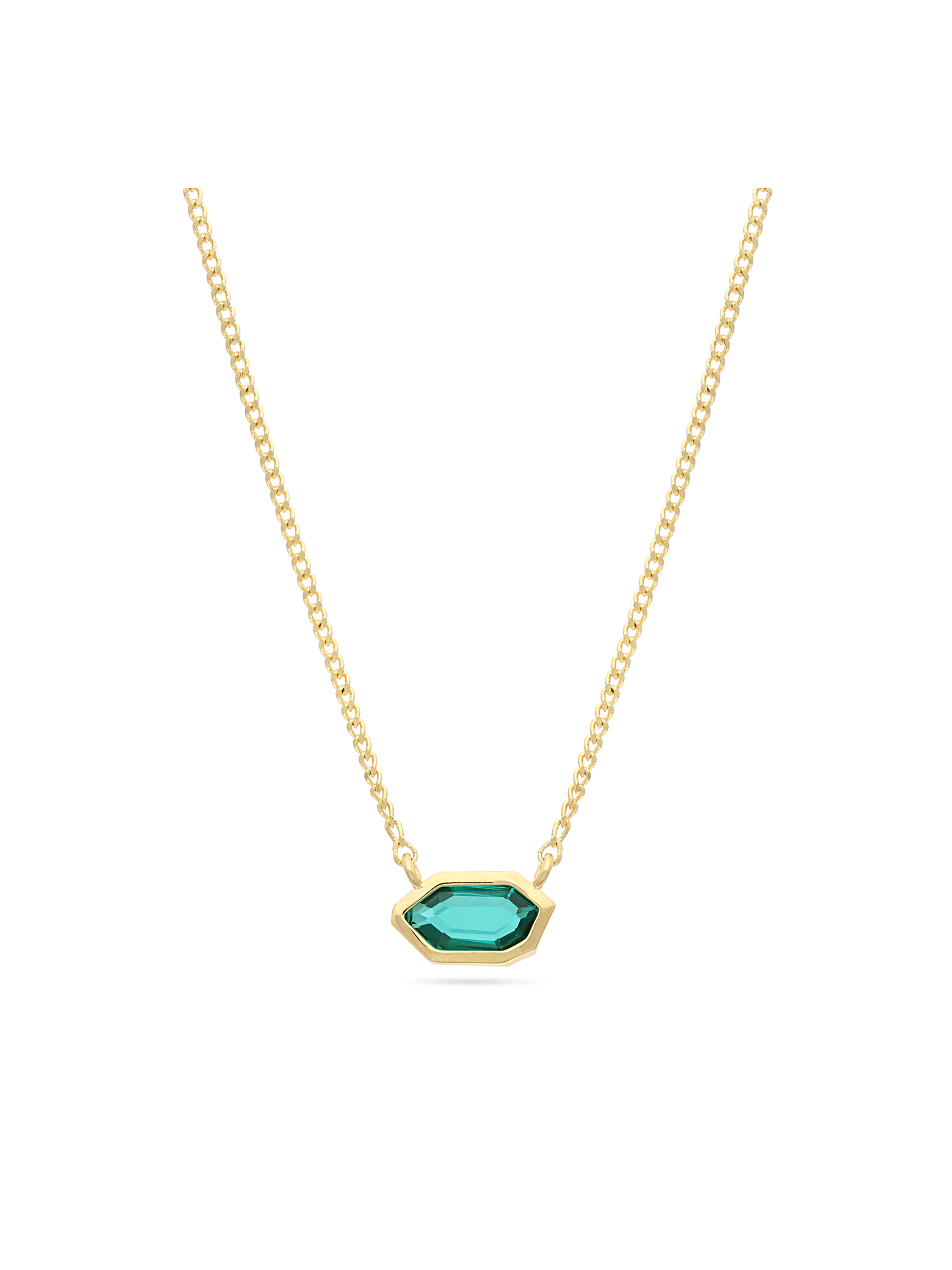 - Design: O pendente, com 1.3 cm de largura e 0.5 cm de comprimento, apresenta uma forma hexagonal elegante, adornada com vidro cristal verde, que confere um toque de cor sofisticada.