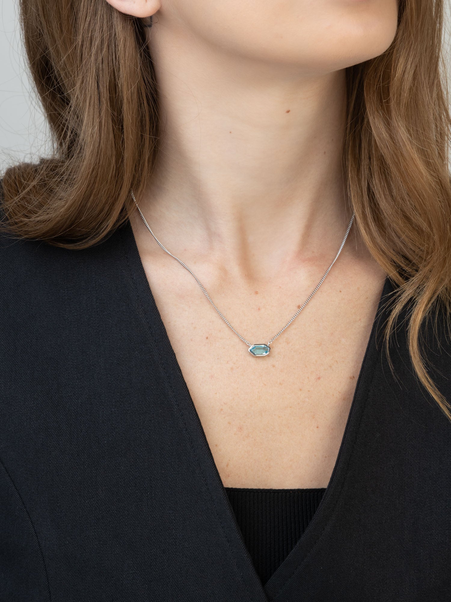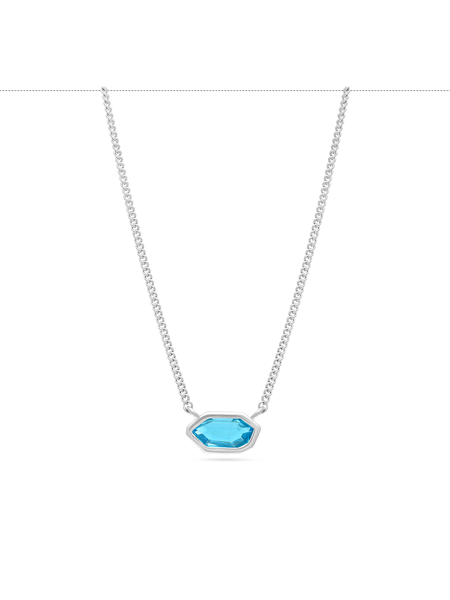 Descubra a delicadeza e sofisticação do Fio com Pendente em Prata de Lei 925. Com um elegante vidro cristal azul céu e design hexagonal, esta peça feita à mão é perfeita para quem aprecia a combinação de simplicidade e brilho em acessórios únicos.