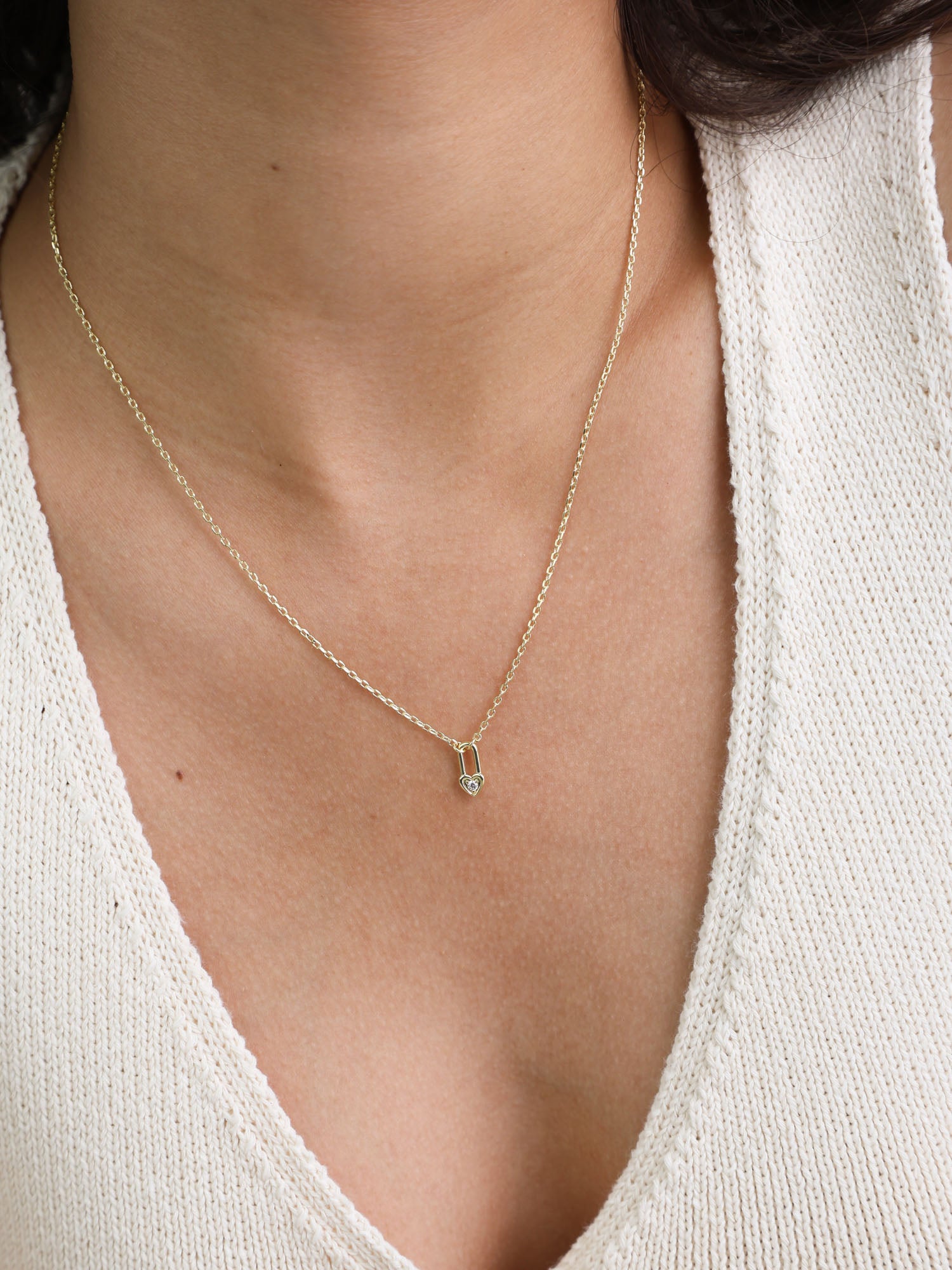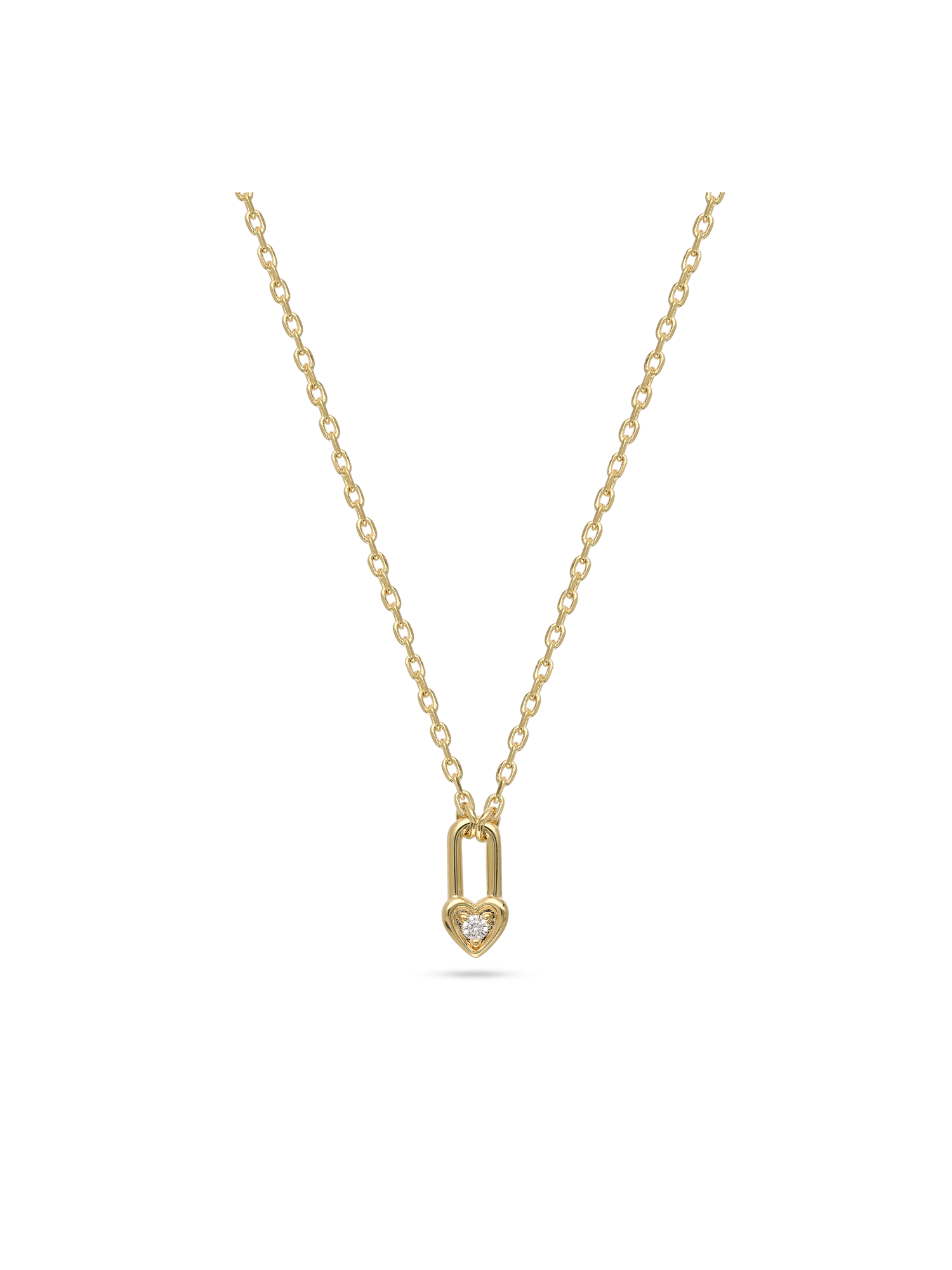 Fio com pendente, Banhado a Ouro, Zircónia de cultivo, Claro, Coração, Fechadura, Feito à mão, Dourado, largura do pendente: 0.5 cm, comprimento do pendente: 1.1 cm, 2.57 gramas.