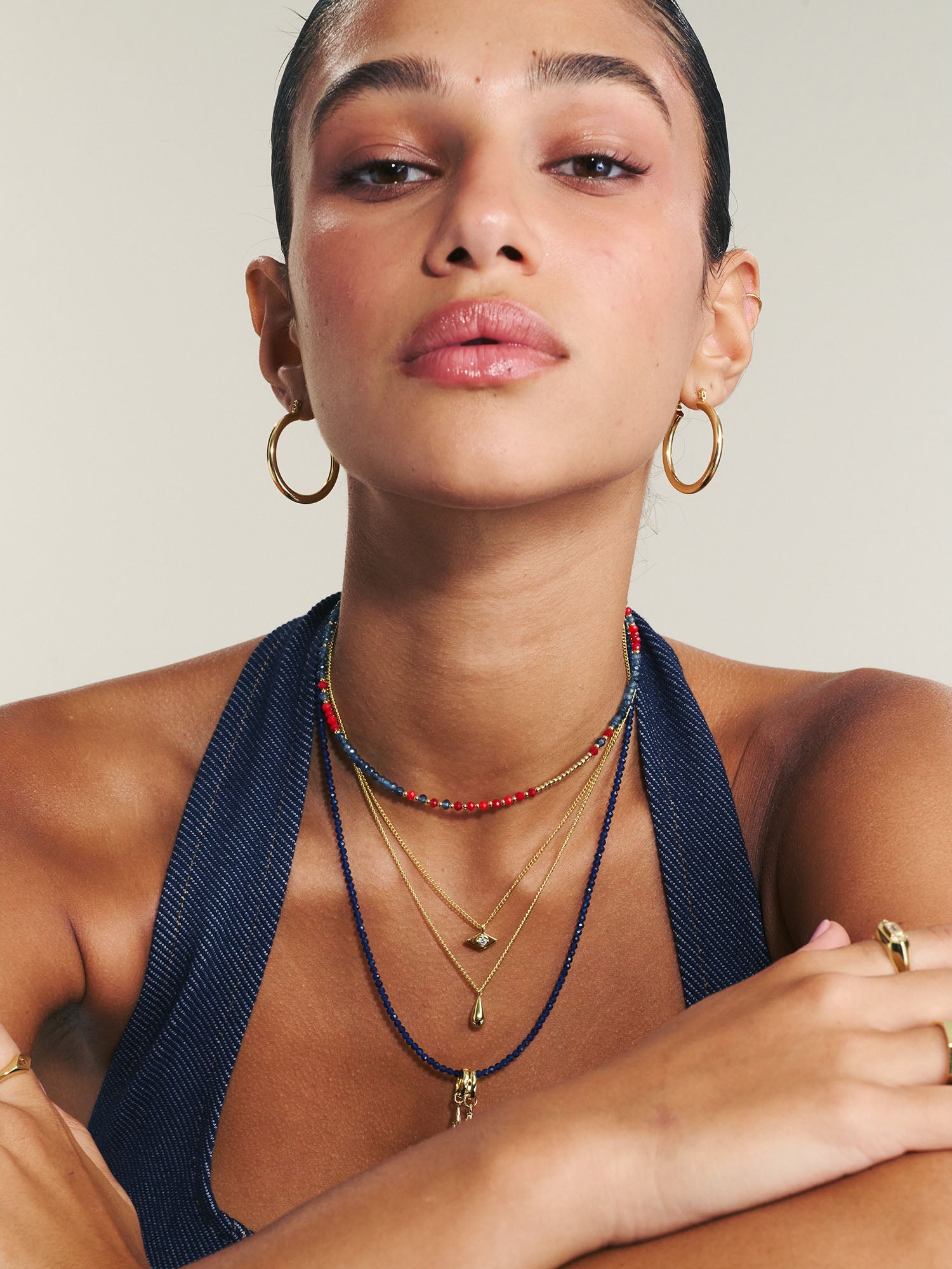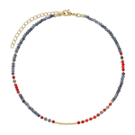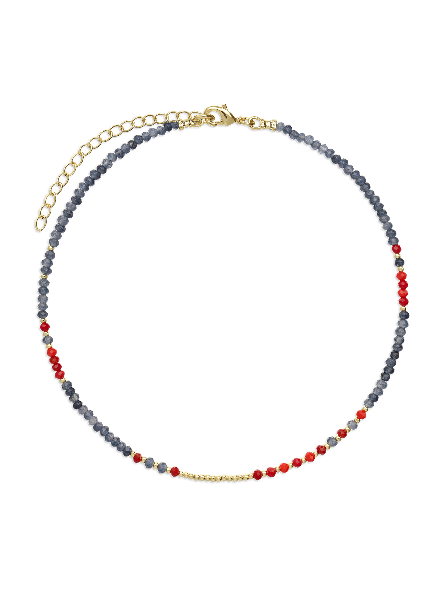 Colar choker banhado a ouro com cristais vermelhos e jadeíte azul