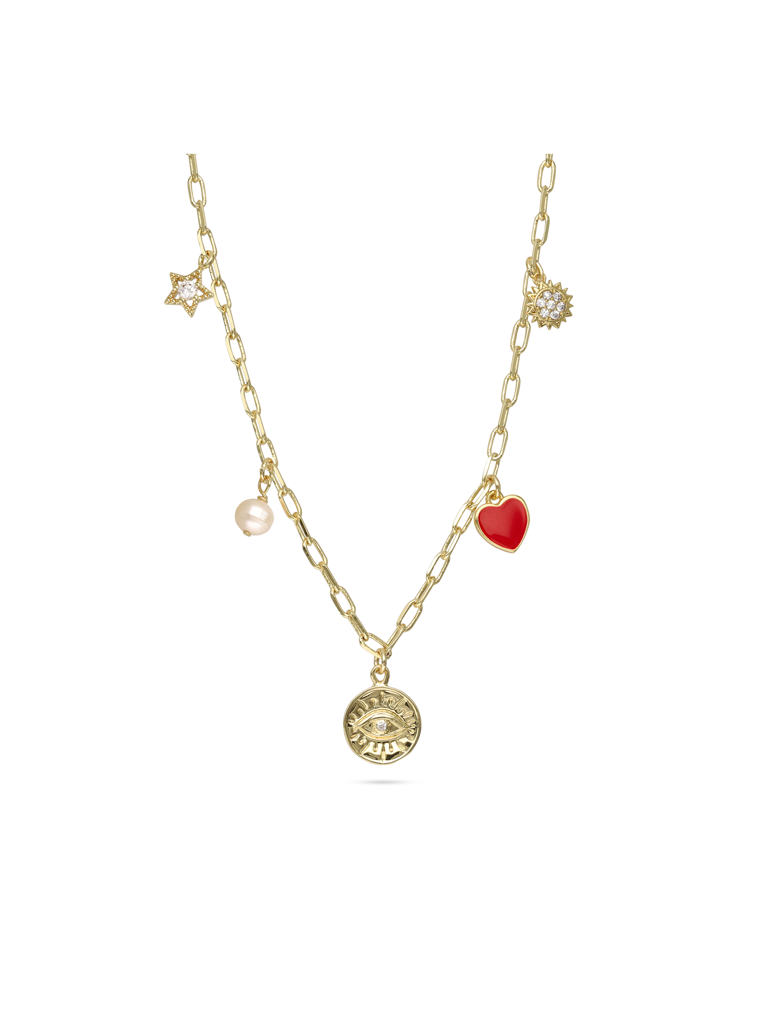 Cadeia de elementos, Banhado a Ouro, Zircónia de cultivo, Pérola cultivada, Esmalte, Colorido, Variedade de formas, Feito à mão, Dourado, 7.56 gramas.