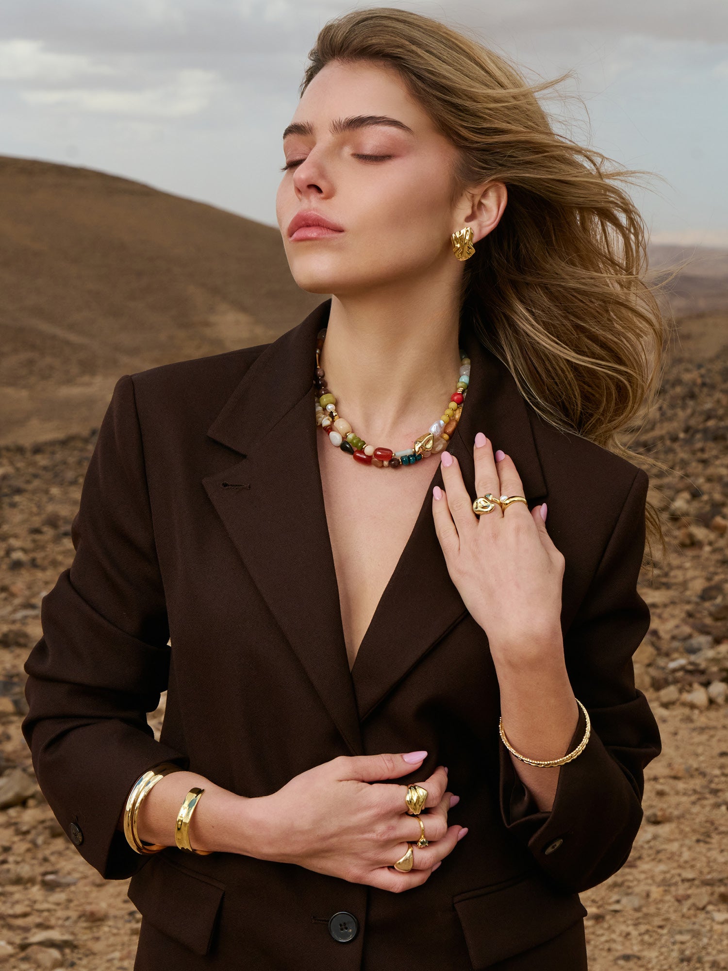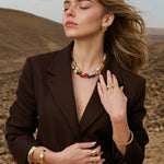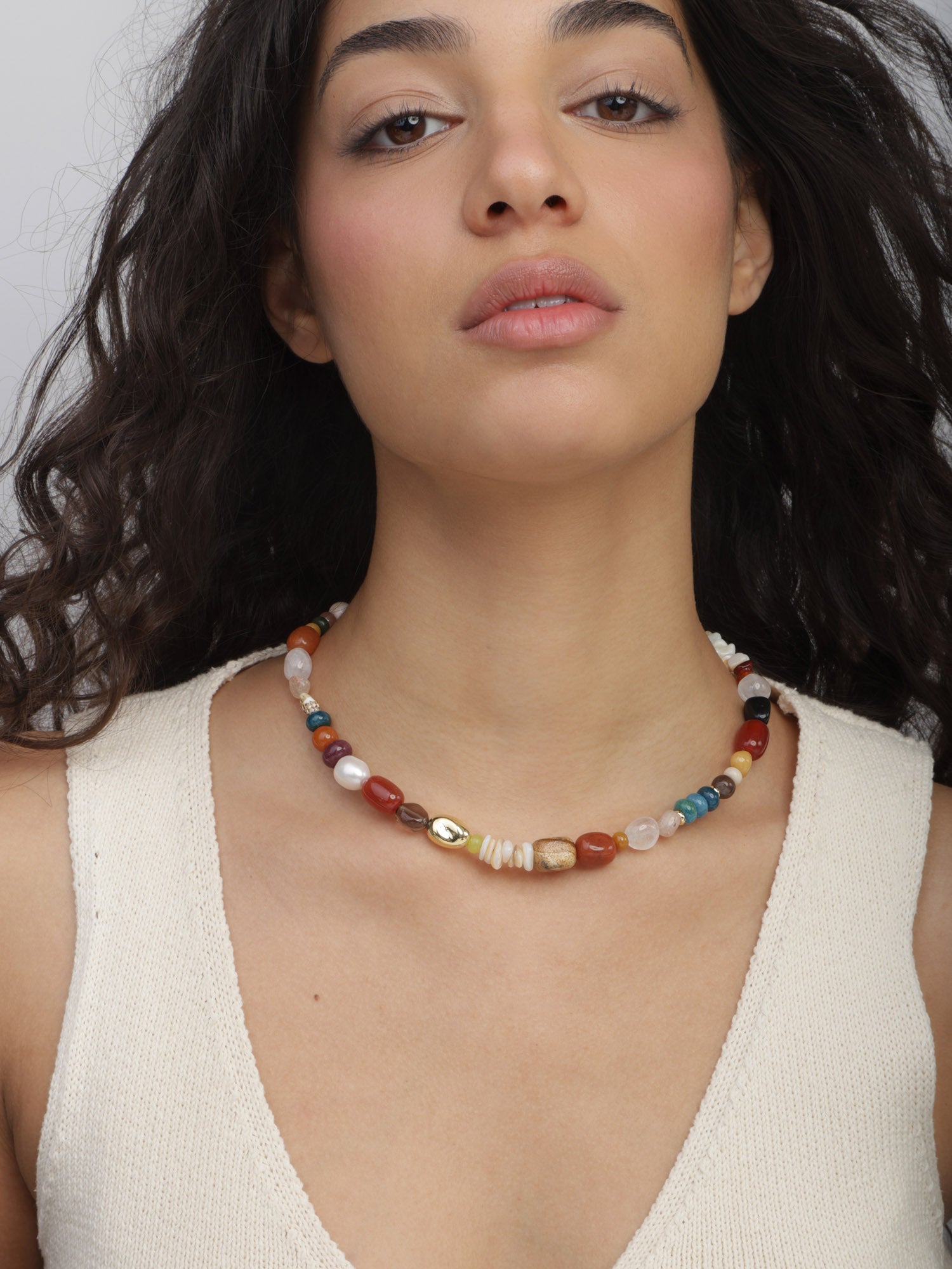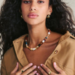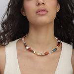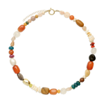 Colar de pedras banhado a ouro com ágata, quartzo turquesa, cornalina, madrepérola, jadeíte e jaspe