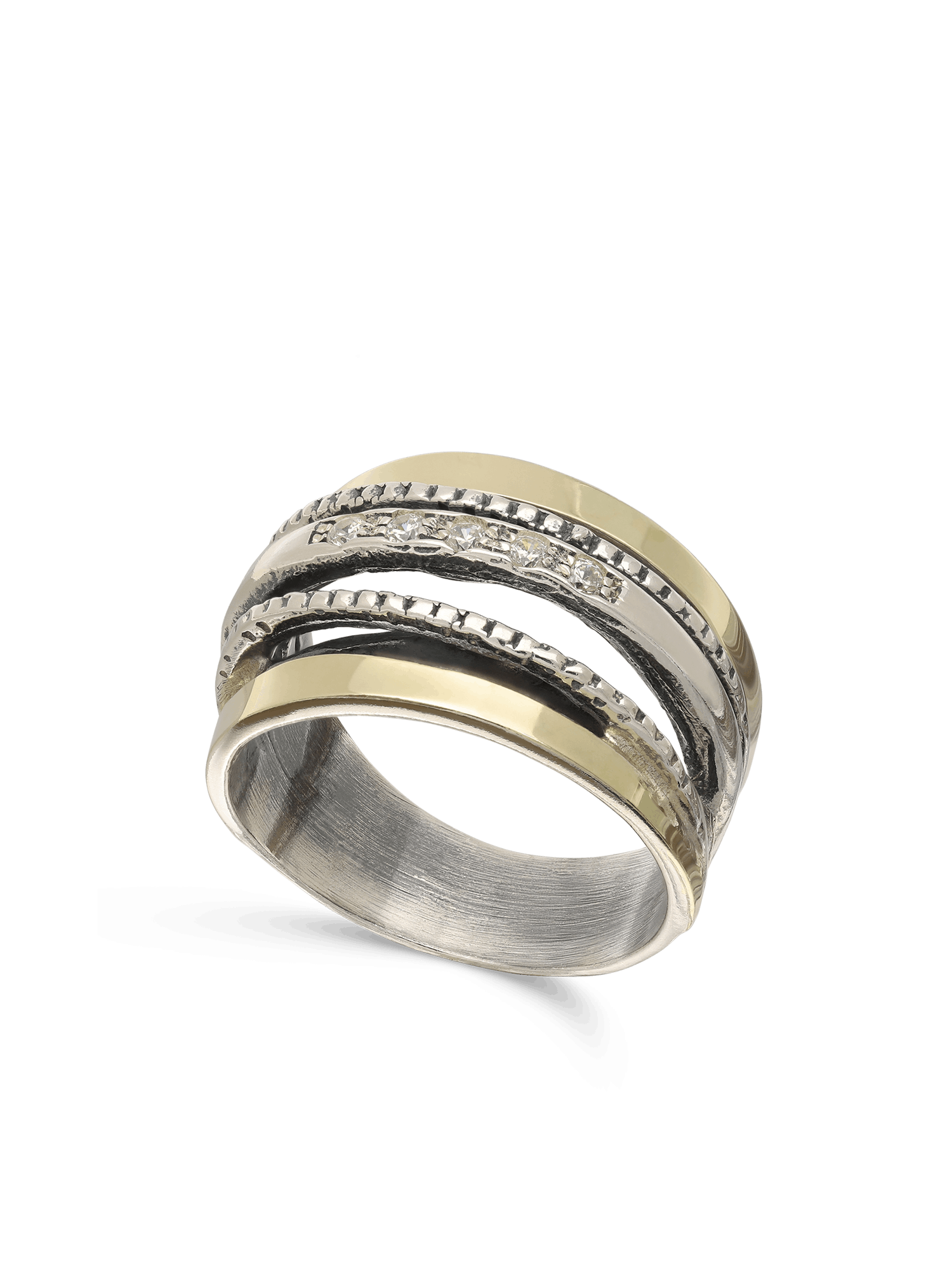 Anel Grande, Prata, Prata de lei com ouro 9K, Zircónia de cultivo, Claro, Círculo, Feito à mão,, DOIS TONS, altura do anel: 1.3 cm, 6.70 gramas.
