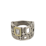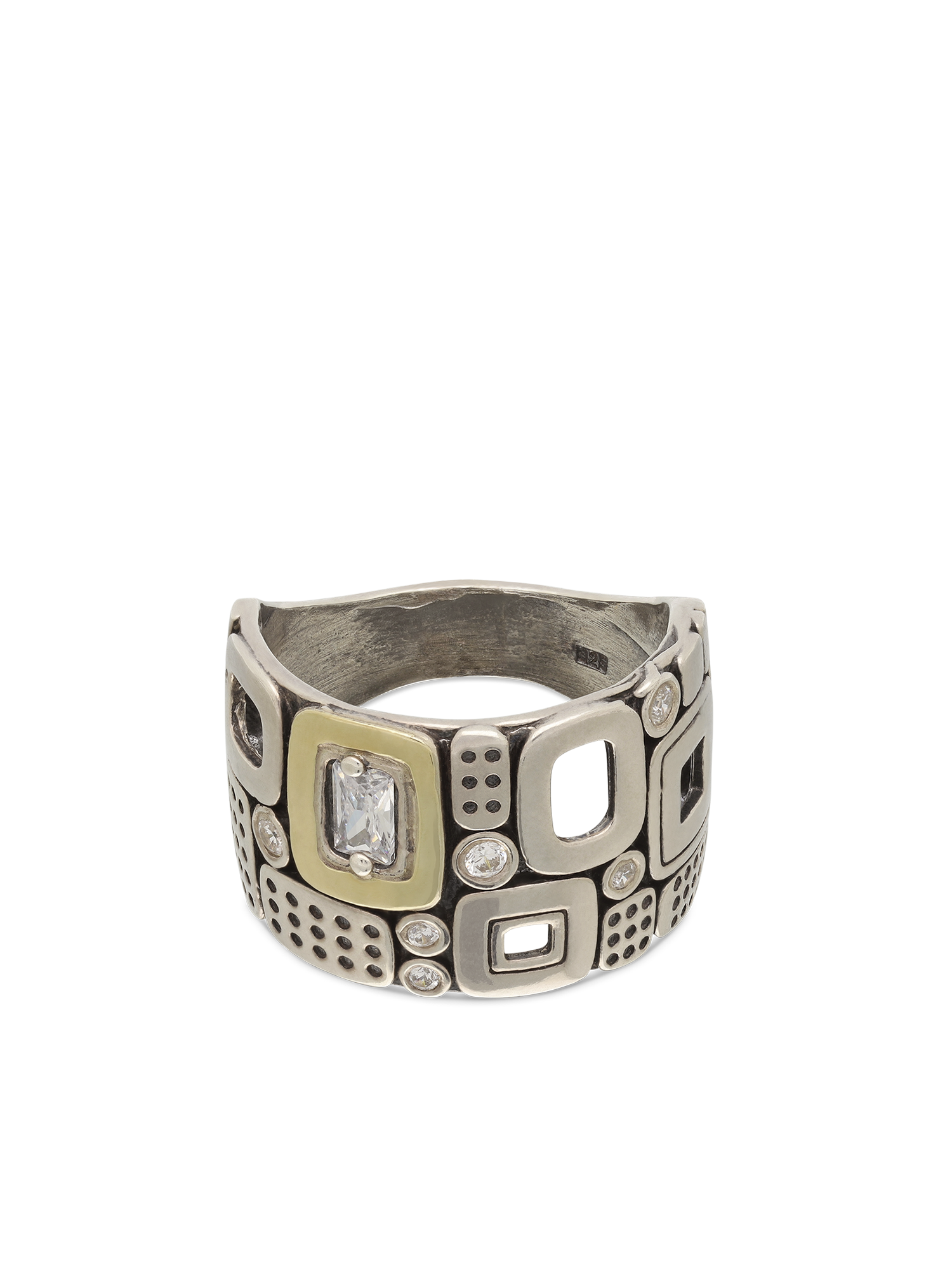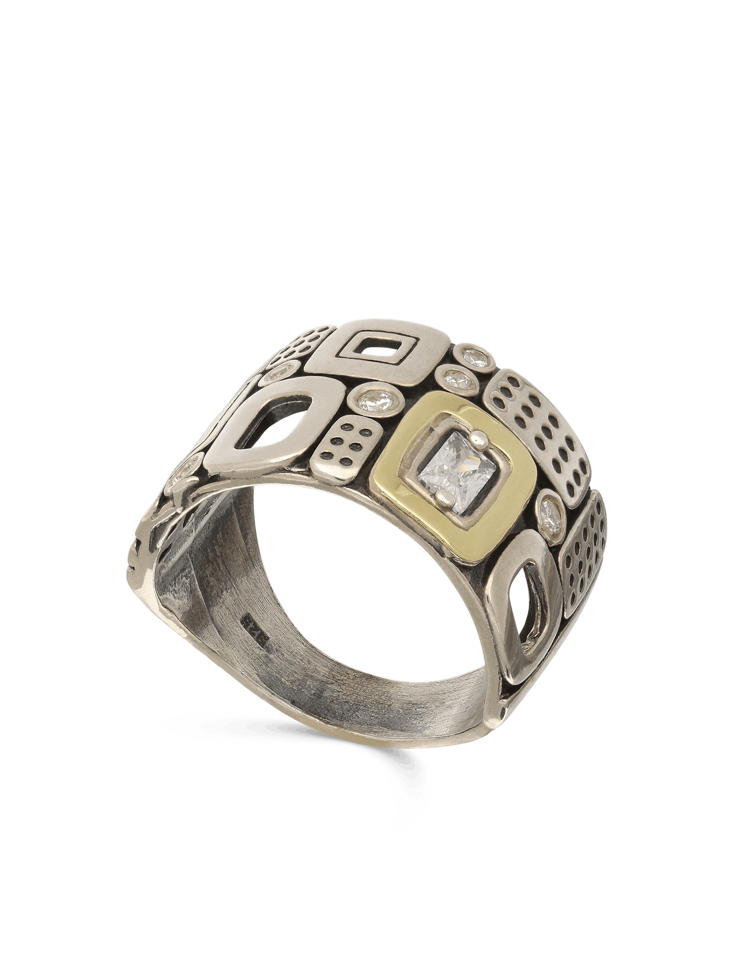 Anel Grande, Prata de lei com ouro 9K, Zircónia de cultivo, Claro, Variedade de formas, Feito à mão, DOIS TONS, altura do anel: 1.5 cm, 8.40 gramas.