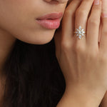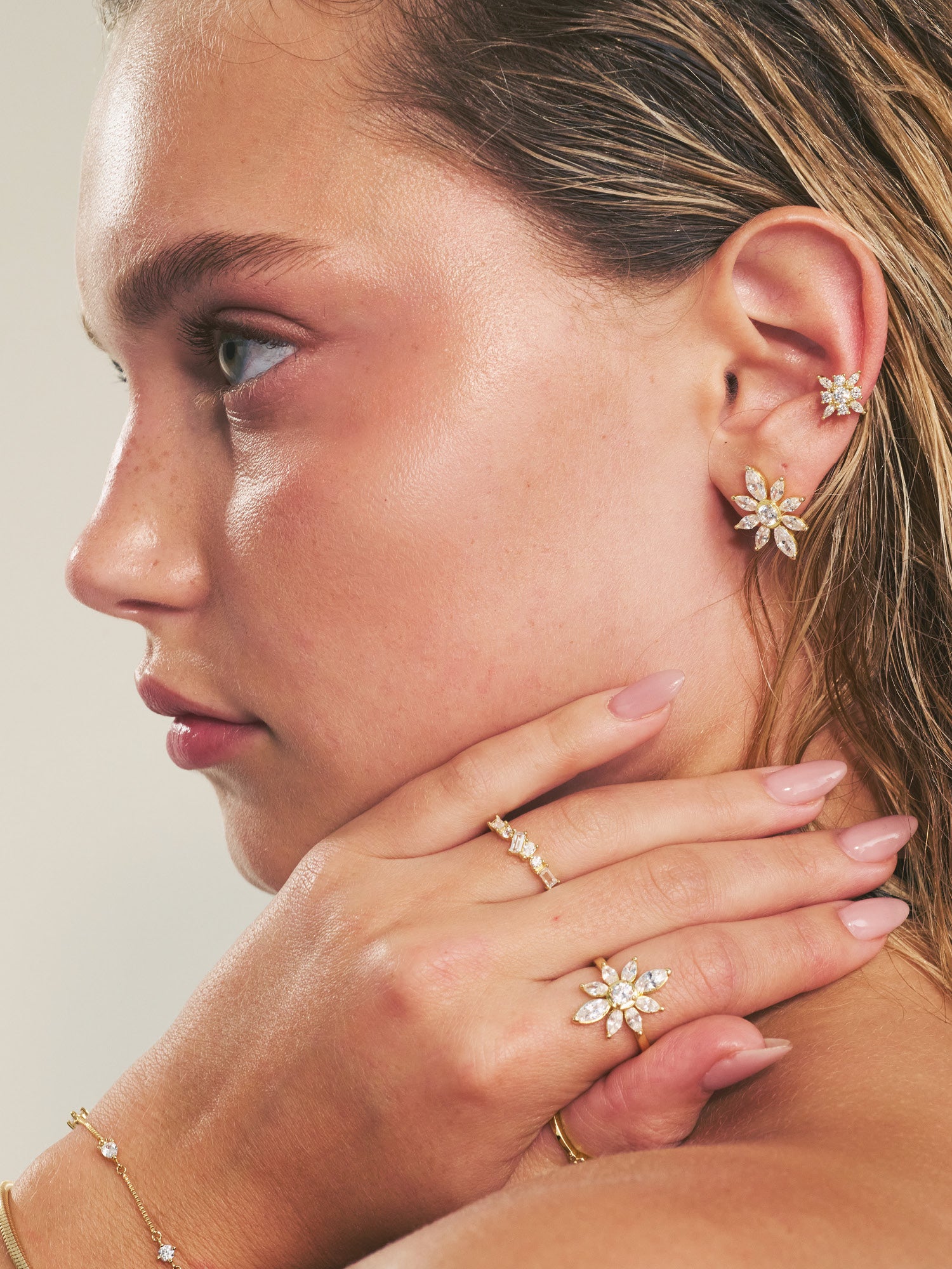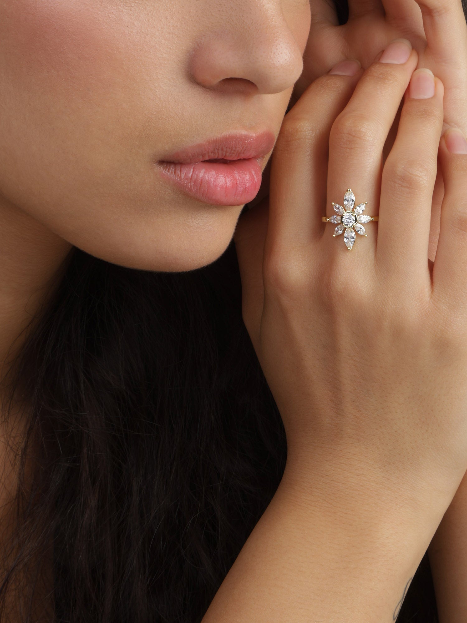 Anel Delicado, Banhado a Ouro, Zircónia de cultivo, Claro, Flor, Feito à mão, Dourado, 3.06 gramas.