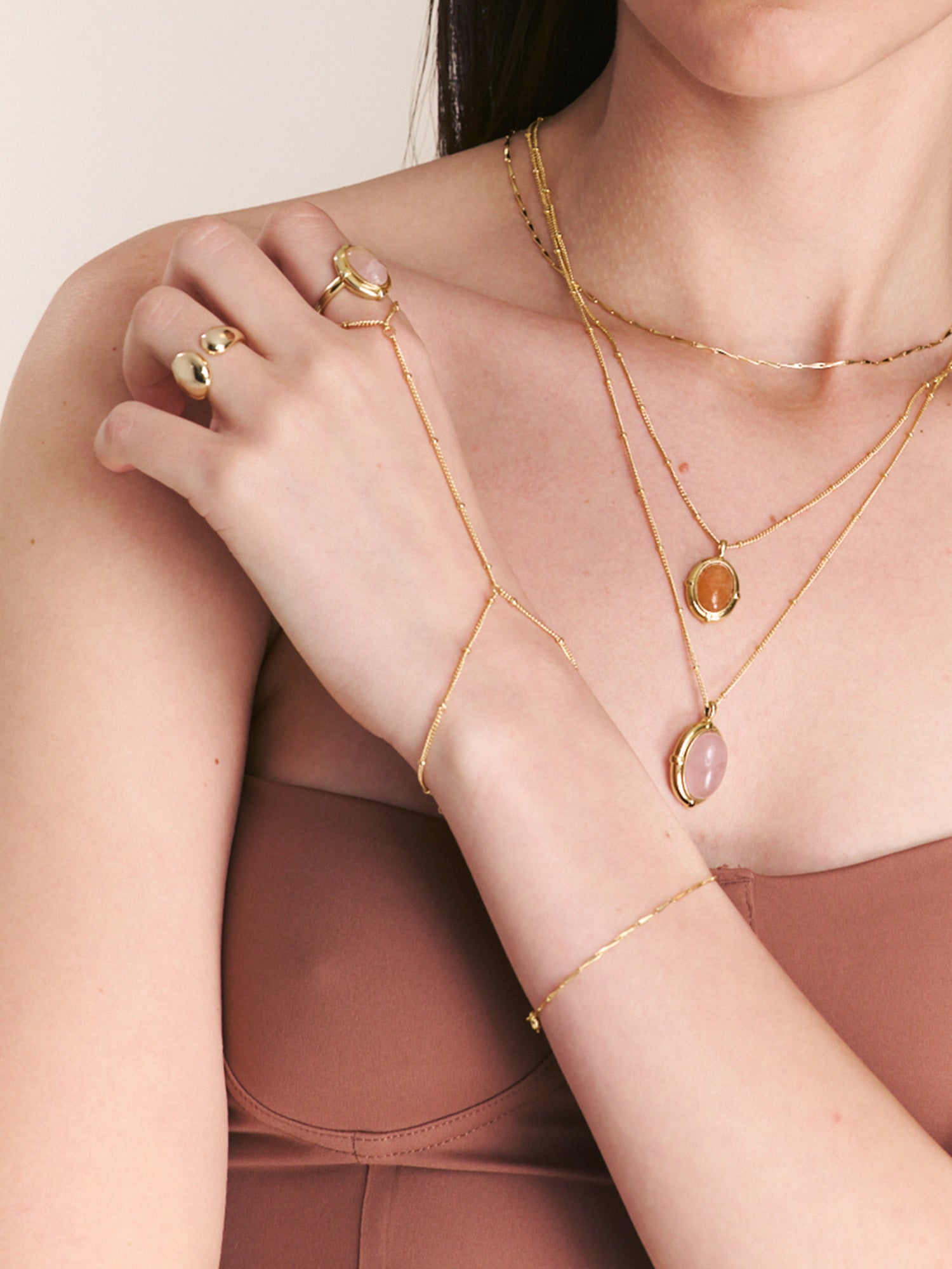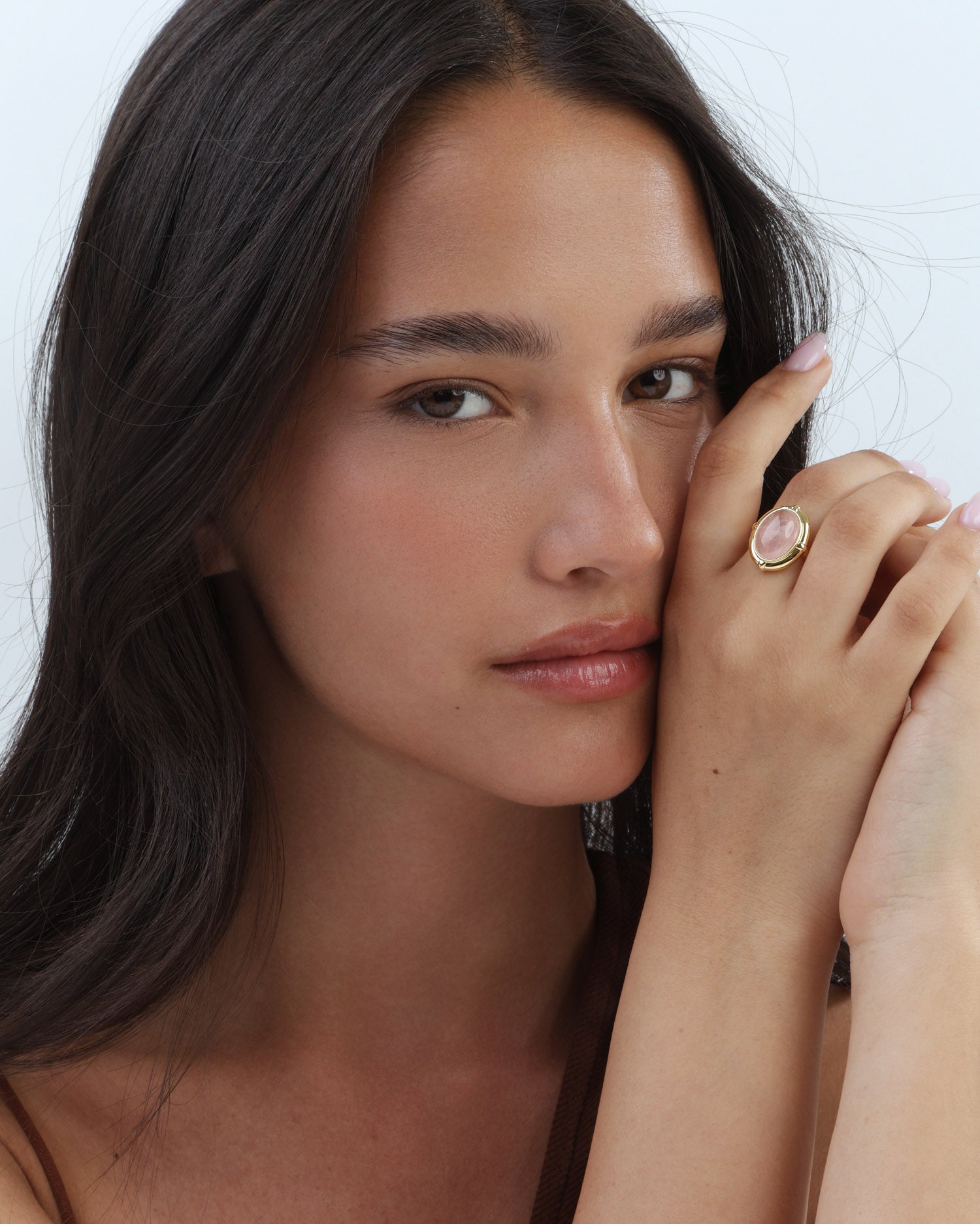 Anel banhado a ouro com quartzo rosa